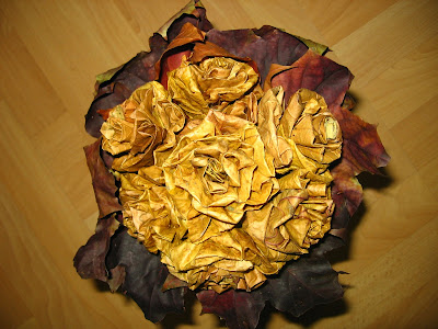 Potrzebujecie świeżych liści klonu. Budowę różyczki zaczynamy od liści mniejszych pod względem gabarytów, a im dalej posuwamy się w pracy tym używamy większych liści. Bierzemy pierwszy liść i zginamy go na pół tak aby każdy wystający róg został zagięty. To tworzy nam prostą linię, która będzie stanowić płatki róży. Z tak zgiętego liścia zwijamy rulonik, a następnie dodajemy kolejne zagięte liście, okręcając rulonik - tworząc tym samym kolejne warstwy płatków. Aby róża lepiej się prezentowała najlepiej odrobinę marszczyć kolejne warstwy. Jeśli dochodzimy do momentu kiedy trudno jest nam już utrzymać liście związujemy je drucikiem florystycznym lub jakąś nicią. W ten sposób zabezpieczymy wykonaną pracę. Takie zabezpieczenie można wykonać parę razy podczas pracy nad jedną różyczką - od tak dla ułatwienia :)